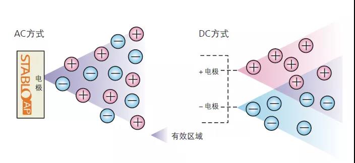 STABLO-AP型靜電消除器采用交流電暈放電的形式,與DC方式對比,可以明顯看出采用AC方式的除靜電器有效區域更大。